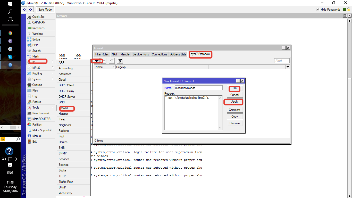 Click on IP, firewall, layer7 protocol. Give it a title and paste these codes where applicable :