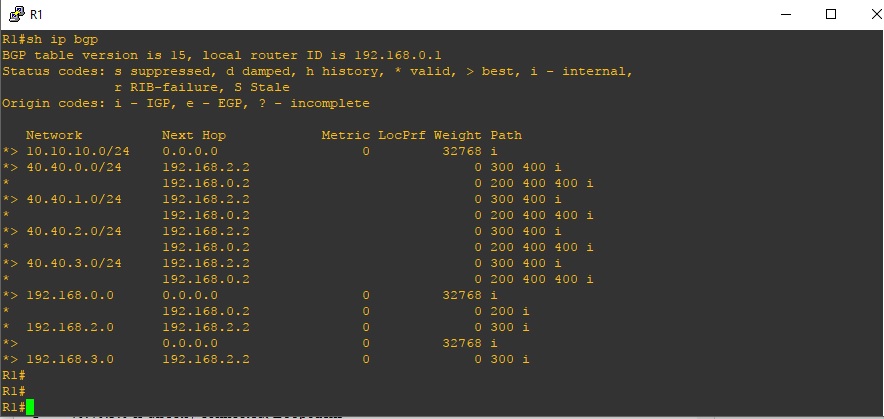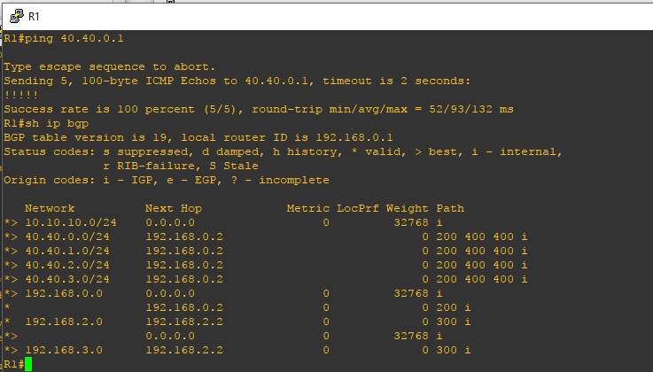 From the output shared above, we observed that the 40.40.0.0 to 40.40.3.0 were received via ISP1 and ISP2 but ISP2 is preferred simply because we prepended the routes towards ISP1 by increasing the as-path.