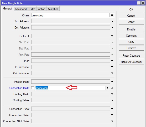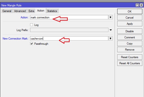 set chain to prerouting, click on connection mark and choose the recently created connection mark, click on action and choose mark packet, then type in a name for the packets. I used cache-pack.