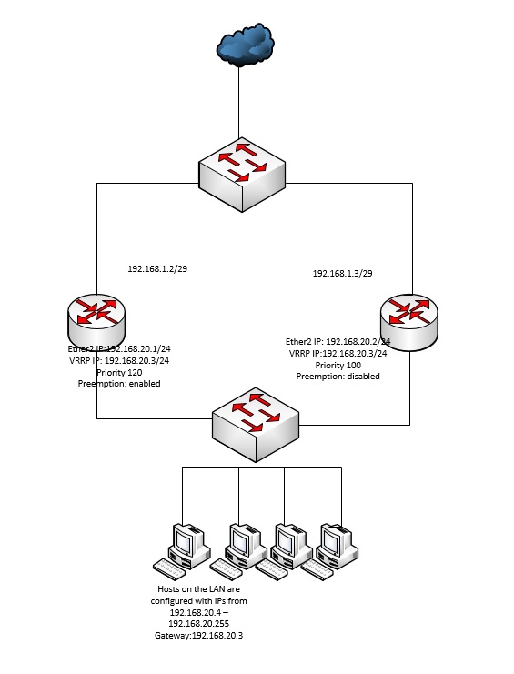 Unlike Hot Standby Routing Protocol (HSRP) and Gateway Load Balancing Protocol (GLBP) which are Cisco proprietary protocols, the VRRP can be used between different vendor routers. In this post, I will demonstrate how you can set up between two Mikrotik routers.