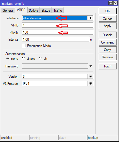 >> Click on VRRP tab>> choose the interface connecting to your LAN switch>> set the priority above 100 for the router you want to be the active VRRP router>>check the box for preemption (this will allow the active router to take back control upon recovery>>click on apply and ok. The default interval to consider the router down and switch control to the backup router is 1 second. You can increase it if you want, but I suggest you leave it at default.