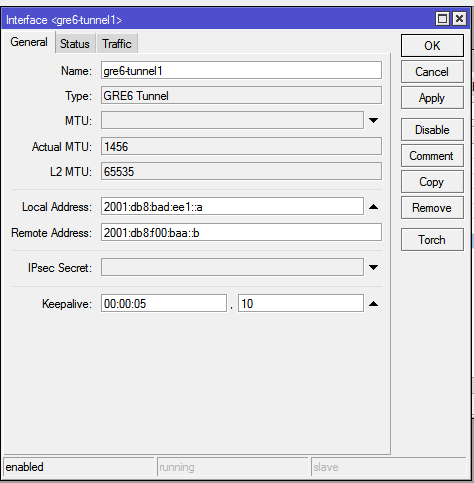 >> /interface gre6 add local-address=2001:db8:f00:baa::b remote-address=2001:db8:bad:ee1::a keepalive=5