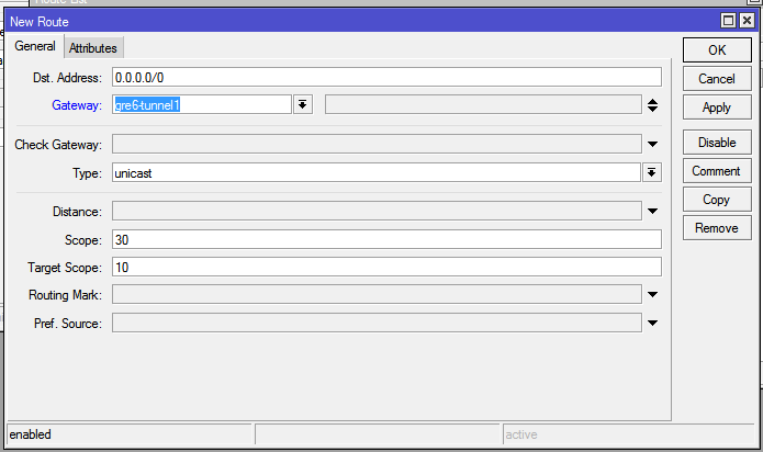You may also like: How to configure a GRE tunnel between a Mikrotik router and a Cisco routerSet a default route to reach the internet through the GRE6 tunnel interface. See below: